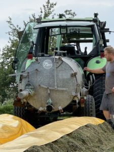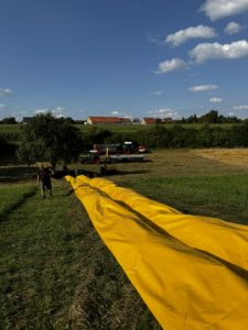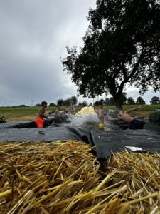 Gemeinsam stellten wir wie in den letzten Jahren die Strohballen auf, breiteten die Plane aus und verlegten Strom und natürlich die lange Folie für die Rutschbahn. Nach einer kleinen Stärkung mit Pizza und Urplatz von „Oma Karin“ ließ Bernd und Hannes auf das Komando von … - Jakobi Markt Nellingen