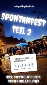 Am vergangenen Freitag war der Feiertag Allerheiligen und aufgrund der Aussage unseres Vorstands „Am 1.11. war noch nie schlecht Wetter!“ entschieden wir uns in der Ortsmitte erneut ein Spontanfest zu machen. Also kurzer Hand die Schirmbar aufgebaut, Kühlschrank, Stehtische und Musik hingestellt und schon konnte … - Don’t drink and drive